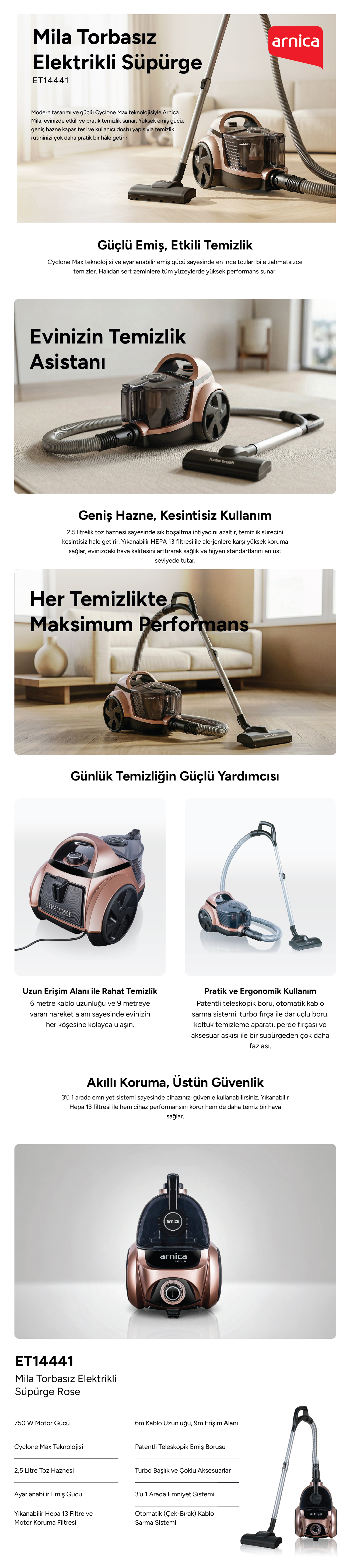 Arnica Mila ET14441 Toz Torbasız Elektrikli Süpürge Rose