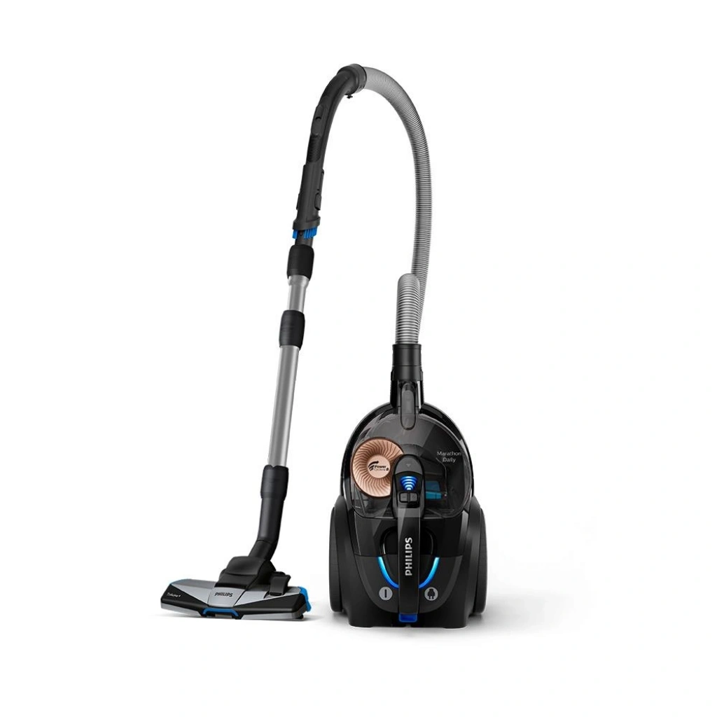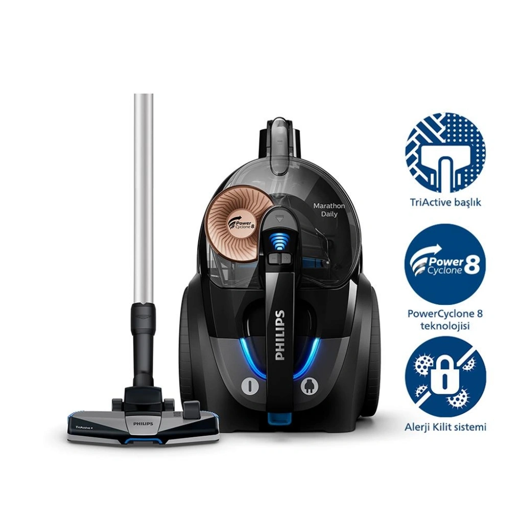 TriActive+ başlık, tek seferde 3 temizlik hareketi kullanır. Özel olarak tasarlanmış taban, halılardaki tozları derinlemesine temizlerken; daha büyük kalıntıları çekmek için ön kısımda daha geniş bir açıklık bulunur. Başlığın her iki tarafındaki hava kanalları ve fırçalar, duvarların veya mobilyaların yanındaki toz ve kirleri alır.