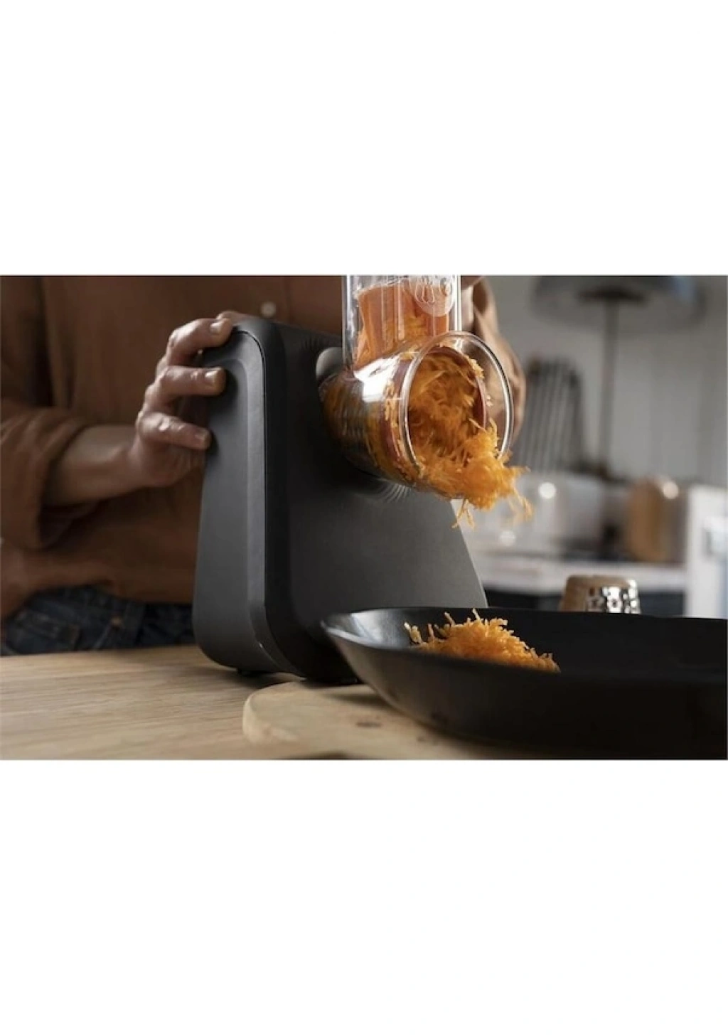 Her seferinde pürüzsüz rendeleme, dilimleme ve parçalama: Kesilmemiş sebzeleri bile yerleştirmeyi kolaylaştıran geniş besleme borusu. Malzemeler doğrudan kaseye iletilir. Koniler kolayca çıkarılabilir.